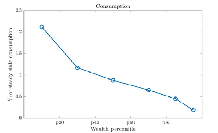 1つ目のタイプとして、Bhandari et al.(2021)やAcharya,Challe, and Dogra(2023)といった研究では、金融政策を行うときに経済格差を考慮することは重要で、所得や資産、消費が少ない家計の消費を喚起するため、ある程度インフレ率の安定を犠牲にしても金融緩和を行うべきであると指摘しています。これらの論文は、いずれも所得、資産、消費量が異なる家計が混在する米国経済を想定したHANKモデルを用いて分析しています。Bhandari et al.(2021)の推計結果が図1なのですが、これをみると、保有する純資産が少ない家計の方が、消費喚起の効果が大きくなるという結果が得られており、そのため、マクロレベルでの家計の効用を最大化するには、家計の消費格差(ばらつき)を抑制するような緩和的な金融政策が望ましいとしています。また、Acharya,Challe, and Dogra(2023)ではより具体的な指摘として、①家計は恒常所得を平滑化することで消費水準を決定するため、所得水準のばらつきを抑制することが重要になる、②所得水準のばらつきが消費水準のばらつきに反映しないような金利操作が重要であり、現在の所得が過度に低い家計が将来所得を見合いに容易に借入ができるよう、足もとの金利を低位にかつ将来の所得が増えるように金融(緩和)政策を行う、③富の水準のばらつきが消費水準に反映されにくくすることが重要で、政策金利の引き下げにより、負債を負っている低所得の家計の利払い負担を緩和し、消費格差を緩和するの3点を挙げています。さらにこの論文では、政策ルールとして、テイラールールでもみられるようなGDPギャップとインフレ率だけではなく、GDPの水準の安定にも留意するようなルールを採用することで、ある程度、最適な金融政策を行うことができるとしています。