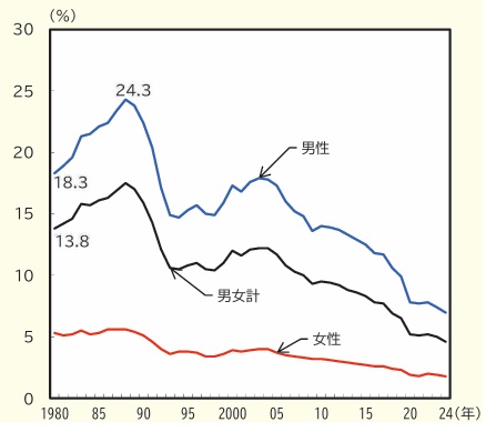 また、同白書の中では他にも数字を示していて、週の労働時間が60時間以上の雇用者の割合を男女別と男女計について示しています。図2がその結果ですが、これをみると、男性、女性共に1990年頃をピークに減少傾向にあることがわかります。