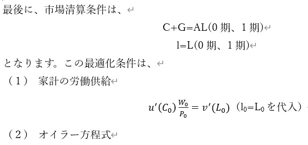 政府部門については、こう考えます。政府は0期、1期にそれぞれG0、G1の政府消費を行いますが、この支出の原資は、0期目は国債を発行して賄い、1期目については、国債の償還とG1分を家計からT1の一括税を徴収して賄います。そのため、政府の予算制約式はP0G0=B0、P1G1+(1+i)B0=T1となります。また、家計は政府消費から効用を得ることはないとします。