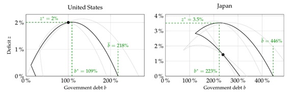 図3は論文で構築したモデルを米国と日本についてカリブレーションした結果として得られる、財政赤字(対GDP比)と政府債務(対GDP比)の定常状態の関係になります。上に上がるほど財政赤字が増え、右に行くほど政府債務が増加する、というみかたになります。つまり、米国については、政府債務が109%の時に財政赤字が最大の2%となり、そこから更に政府債務を積み上げようとすると、維持可能な財政赤字は徐々に減少していくことになります。これはなぜかというと、政府債務を積み上げても財政赤字が拡大しても、いずれも金利の上昇要因になるため、ある程度までは両者を同時に拡大させることができますが、どこかで限界がきます。財政赤字の拡大は政府債務の増大を招きますが、一方で財政赤字は縮小しても、政府債務の残高は積み上がり続けるため、図3の米国のような関係になります。