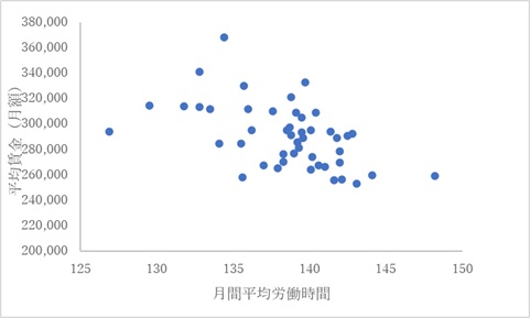 これをみると、月間平均労働時間が多い都道府県ほど、平均賃金が低くなる傾向が伺えます。