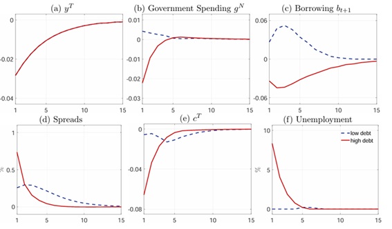 論文ではさらに、政府債務残高の条件を変えて、このことが政府の財政出動に与える影響を分析していて、具体的には、スペインの経済よりも25%低い場合と、逆に25%高い場合について分析しています。ここから得られる結果として、前者については、景気後退期でもソブリンスプレッドが安定しており、政府の借入・政府支出が増えて、消費・失業率が安定した状態にある一方で、後者については、ソブリンスプレッドは大きく上昇し、政府の借入・政府支出は減少し、消費の低下や失業率の上昇がみられるという結果を得ています。